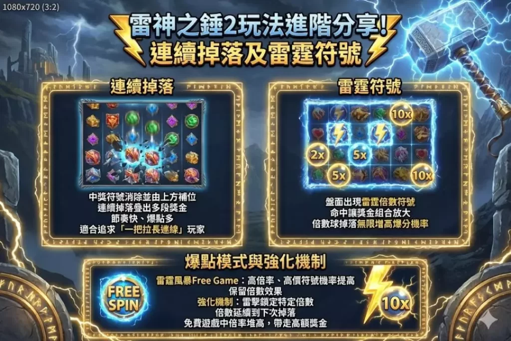 雷神之錘2每次中獎符號會消除並由上方補位,連續掉落就能一路疊出多段獎金,節奏快、爆點多,特別適合追求「一把拉長連線」的玩家,也就是一次下注較大金額的玩家。