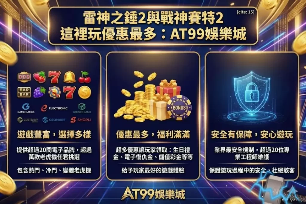 雷神之錘2與戰神賽特2要去哪裡玩?這裡推薦「AT99娛樂城」這間品牌,為何要推薦這間線上遊戲品牌給各位原因很簡單,因為「AT99娛樂城」提供20間電子品牌給予玩家選擇,超過萬款老虎機可以選,不論是熱門老虎機還是冷門老虎機這裡應有盡有還包含變體老虎機可供遊玩!
