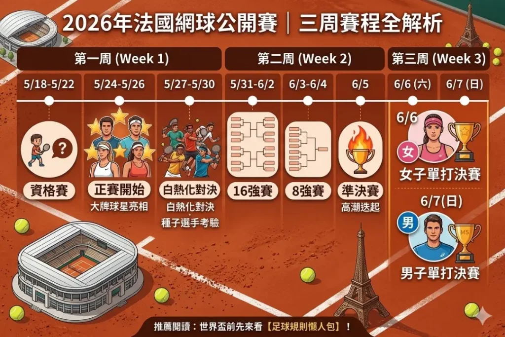 2026法國網球公開賽是紅土的賽事,相信許多老粉絲都已經知道,而想到該賽的玩家也需要注意了,2026法國網球公開賽的時差跟台灣差六個小時左右,所以都會在下午以及凌晨進行,對於粉絲來說肯定是煎熬,不過還是可以透過回放來觀看2026法國網球公開賽的精采賽事。