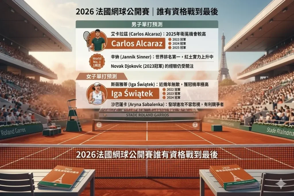 2026法國網球公開賽即將在五月份開打,為期10幾天的賽事就可以決勝出冠軍,可以說節奏相當的快,而且2026法國網球公開賽是紅土場地,所以針對這些選手來說絕對勝卷在握,今天不僅要告訴你2026法國網球公開賽賽程時間外,同時要告訴你男女最具冠軍相的選手!